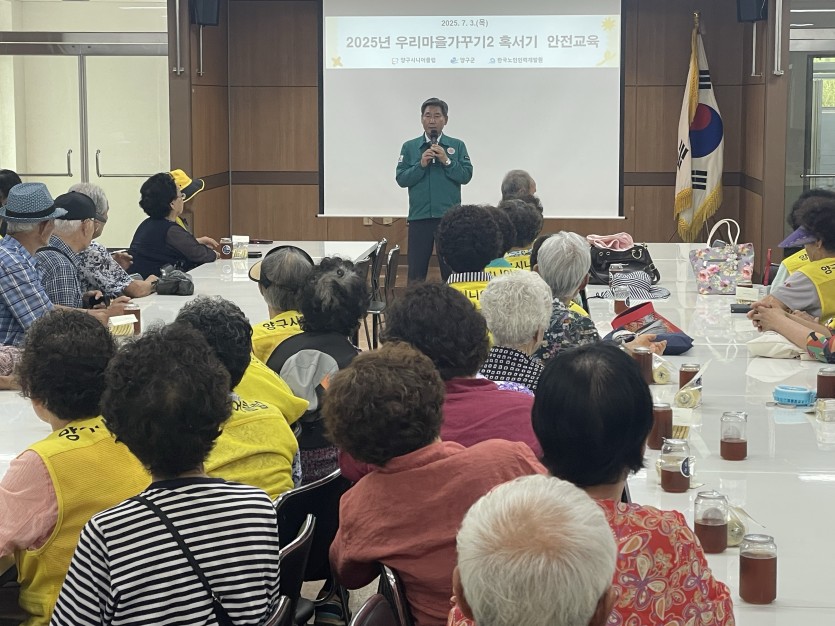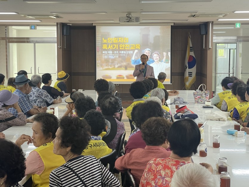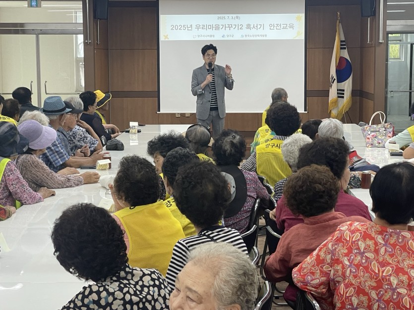 우리마을가꾸기2 사업단 참여자 혹서기 안전교육이 7월 3일 오후 국토정중앙면 복지회관 2층에서 서흥원 양구군수, 김왕규 강원특별자치도의원, 이진형 양구시니어클럽 관장 및 직원들이 참석한 가운데 열렸다. 한국노인인력개발원 소속 강사를 초청한 이번 교육에서는 안전사고 예방, 여름철 재해 대비방법, 온열질환 예방법, 감염병 및 식중독 예방 등이 중점적으로 다뤄졌다.