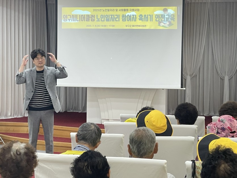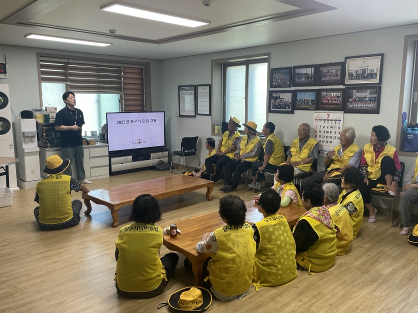 [2025. 7. 9. ~ 2025. 7. 11.] 우리마을가꾸기5 사업단 참여자 혹서기 안전교육 페이지 정보 작성자 관리자 조회 123회 작성일 25-07-11 15:06 목록 본문 우리마을가꾸기5 사업단 참여자 혹서기 안전교육이 7월 9일 해안면 복지회관에서, 11일 동면 팔랑2리와 임당1리 마을회관에서 진행되었다.