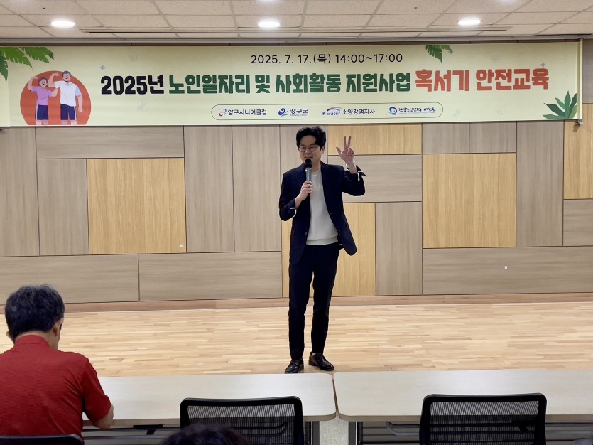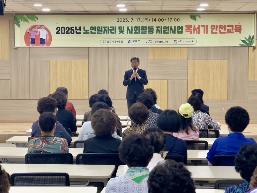 노인역량활용 및 공동체 사업단 참여자 혹서기 안전교육이 7월 17일 오후 양구문예회관 1층 세미나실에서 실시되었다. 한국노인인력개발원 소속 강사를 초청한 이번 교육은 어르신들이 혹서기에 겪을 수 있는 질병 예방 및 응급상황 대처 교육법 등 실생활에 유익한 내용으로 마련됐다.