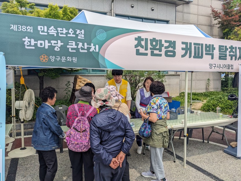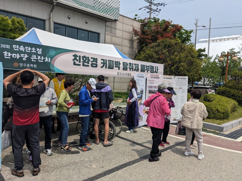 5월 31일, 제38회 민속단오절 한마당 큰잔치 행사장에서 커피박 새활용 탈취제와 비누를 무료로 배부하였다.