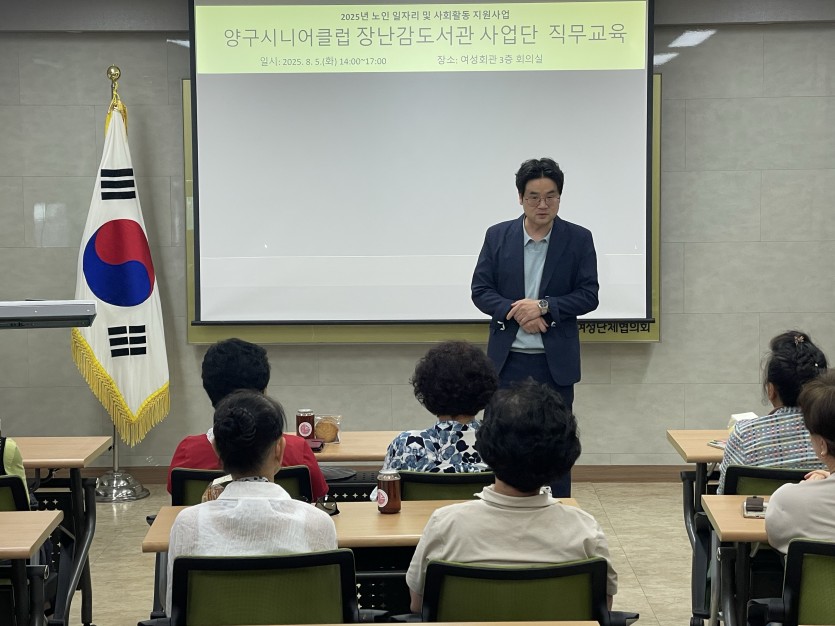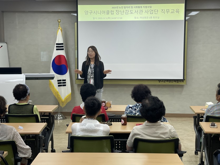 [2025. 8. 5.] 장난감도서관 사업단 참여자 직무교육 페이지 정보 작성자 관리자 조회 105회 작성일 25-08-06 11:16 목록 본문 장난감도서관 사업단 참여자 직무교육이 5일 오후 양구여성회관 3층 회의실에서 진행되었다.