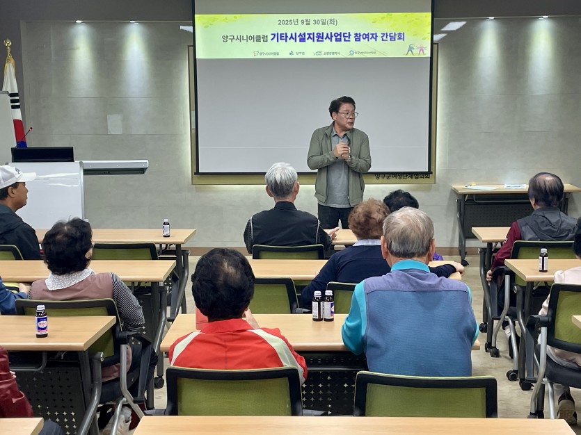 [2025. 9. 30.] 기타시설지원 사업단 참여자 간담회 페이지 정보 작성자 관리자 조회 44회 작성일 25-09-30 11:37 목록 본문 기타시설지원 사업단 참여자 간담회가 30일 오전 11시에 양구여성회관 3층 회의실에서 진행되었다.